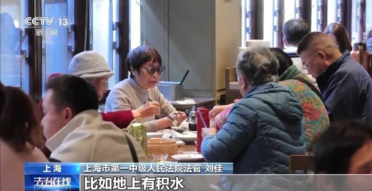 上海市第一中级人民法院法官刘佳:如果说是在餐厅范围之内,是由于餐厅这样一些场所内本身,它所带有的某些风险因素,比如地上有积水,如果有这样一些情形的话,也许在某种程度上可以认定餐厅的经营者,或者说这个商场的管理者没有尽到合理限度内的安全保障的义务,那么他们可能需要承担的一定的赔偿责任。