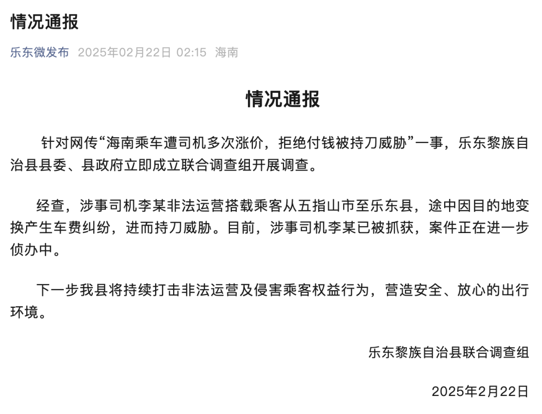 通报称,针对网传“海南乘车遭司机多次涨价,拒绝付钱被持刀威胁”一事,乐东黎族自治县县委、县政府立即成立联合调查组开展调查。