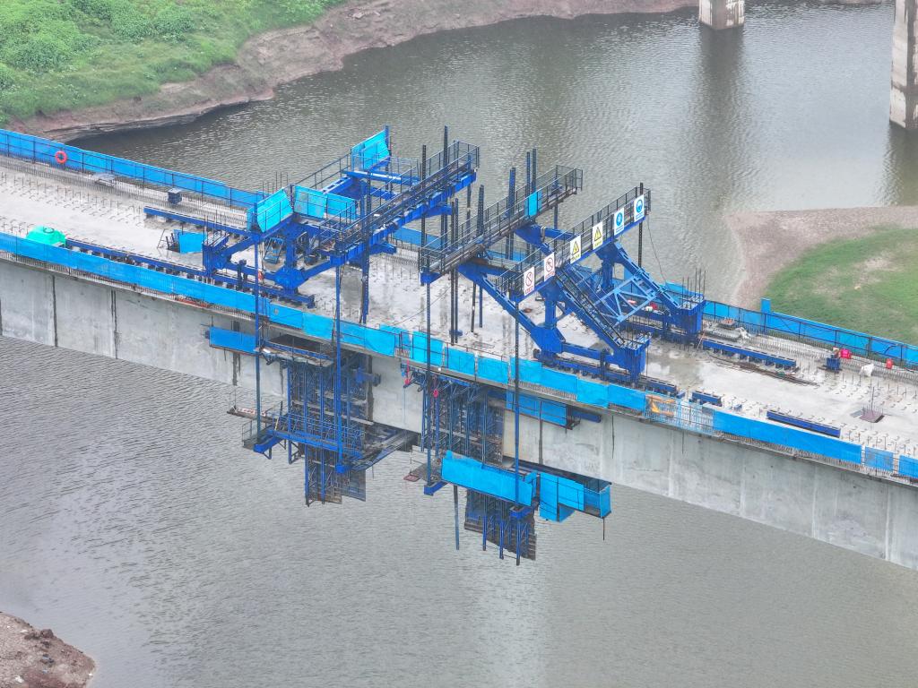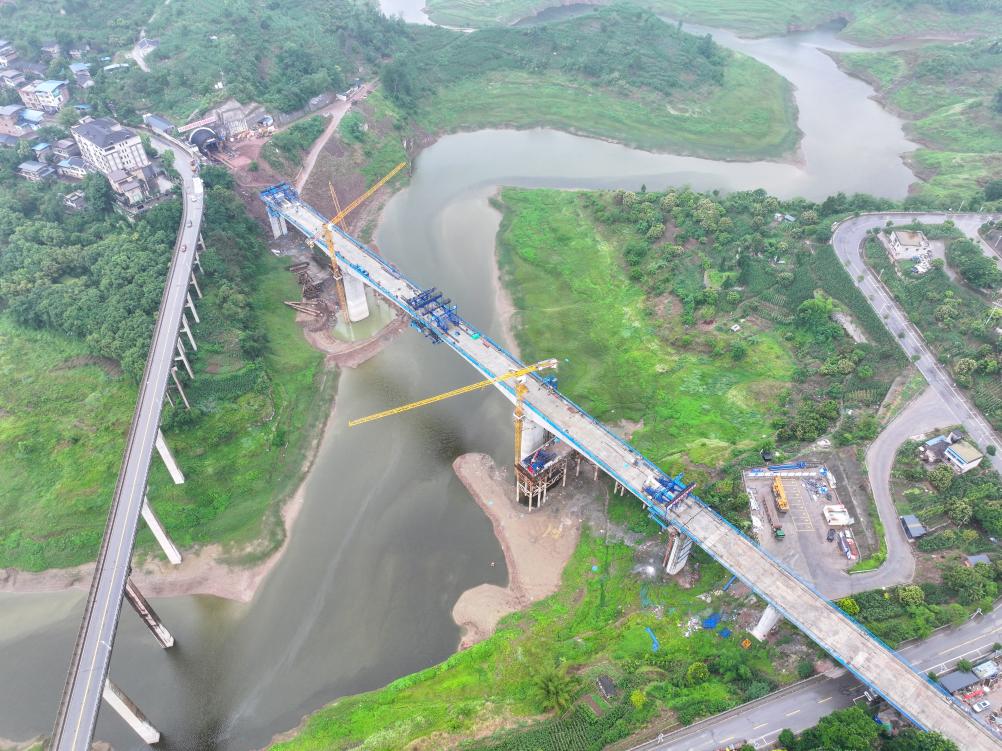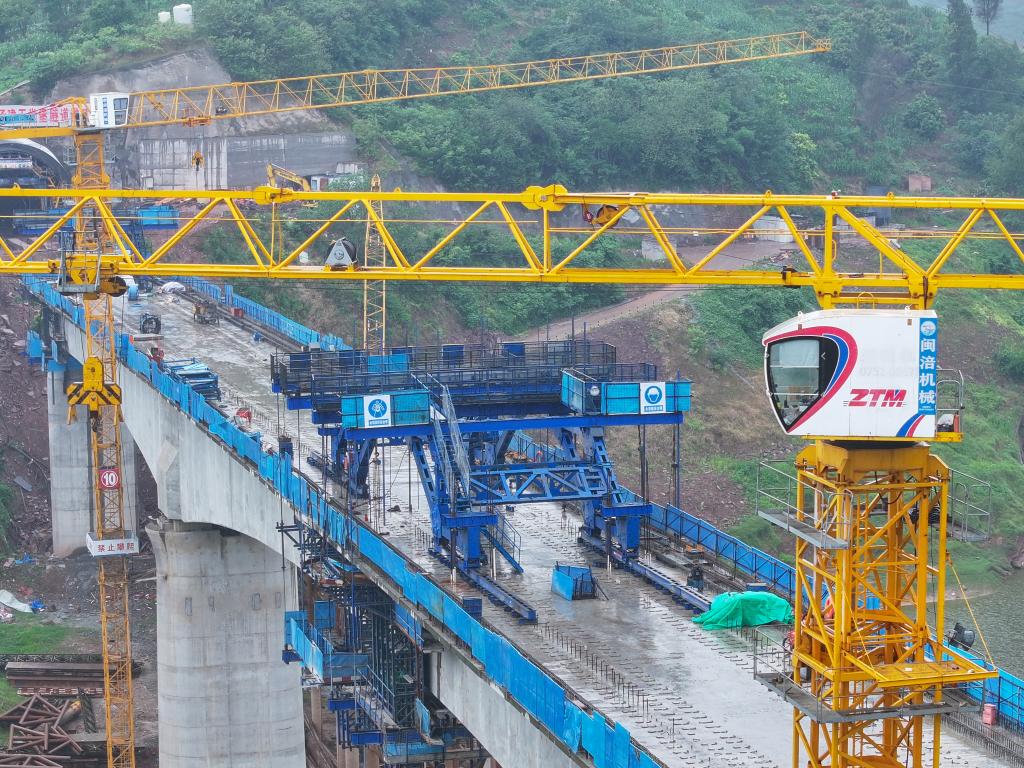 这是5月27日拍摄的渝万高铁珍溪河双线大桥建设现场(无人机照片)。