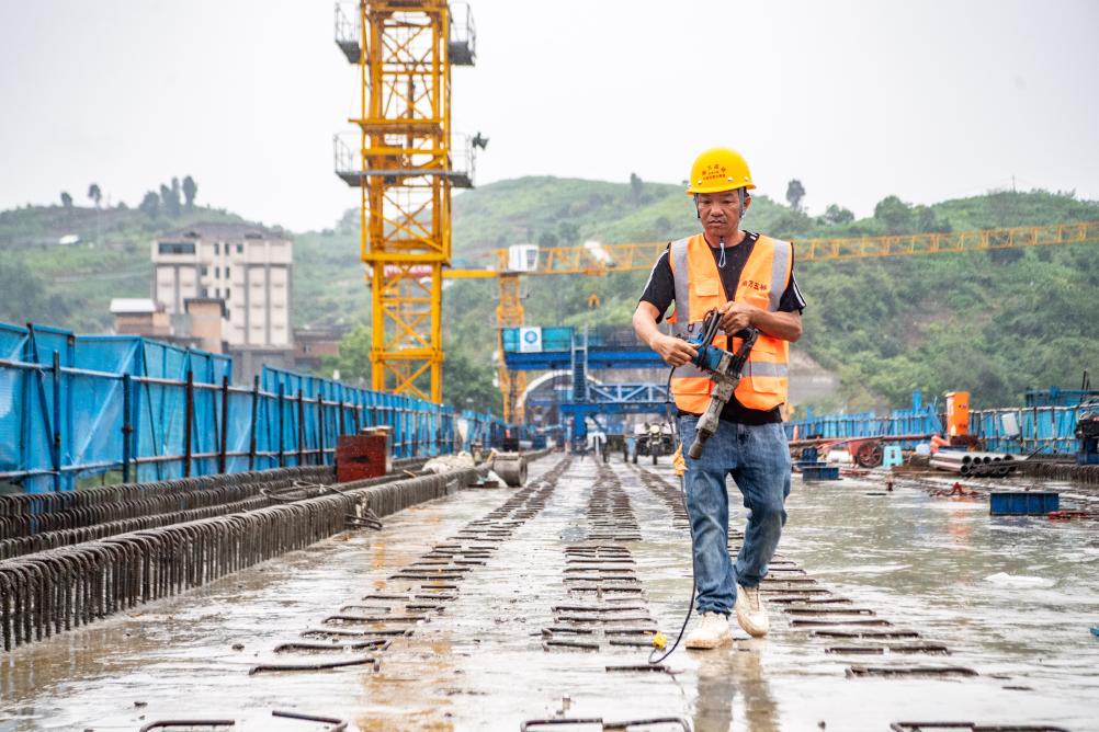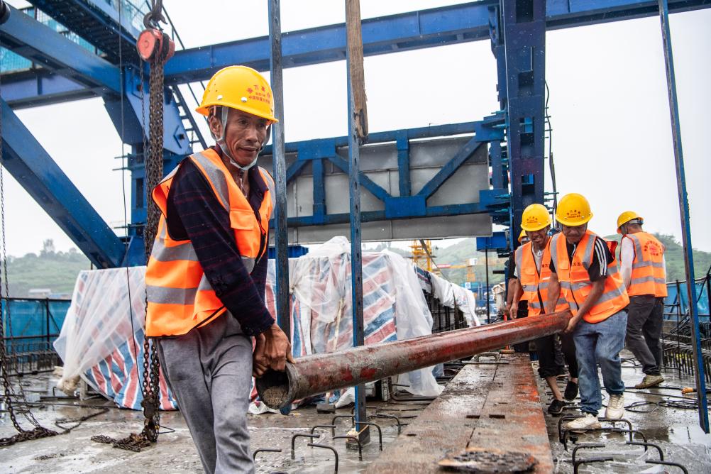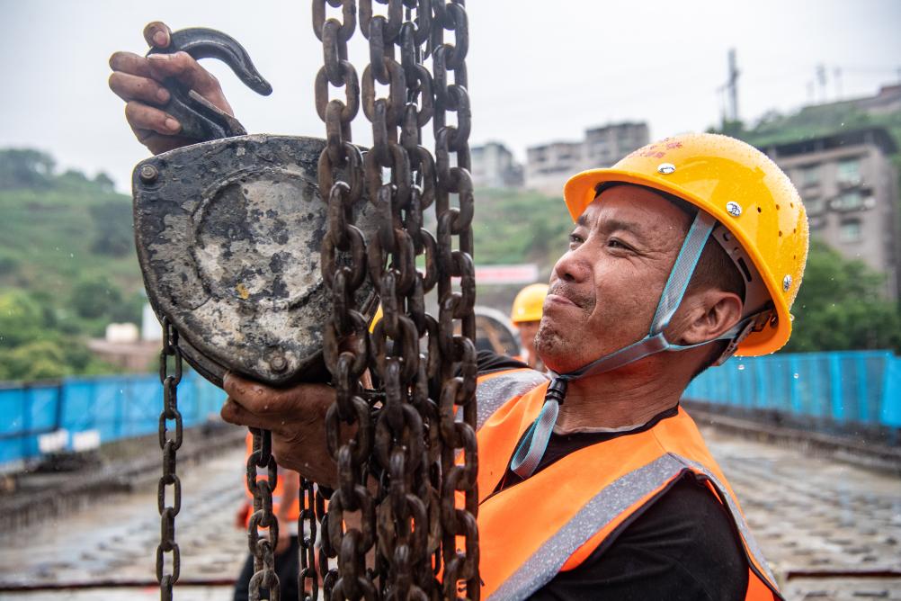 5月27日,工人在渝万高铁珍溪河双线大桥建设现场进行大桥合龙后的收尾作业。