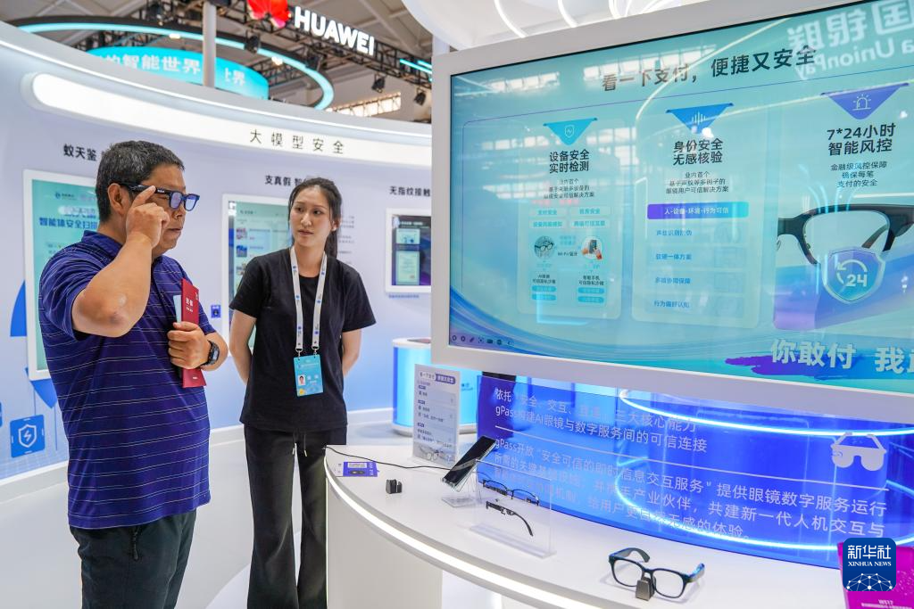 9月15日,观众在云南昆明举行的2025年国家网络安全宣传周配套活动——网络安全博览会暨网络安全产品和服务国际推介会上体验智能眼镜。