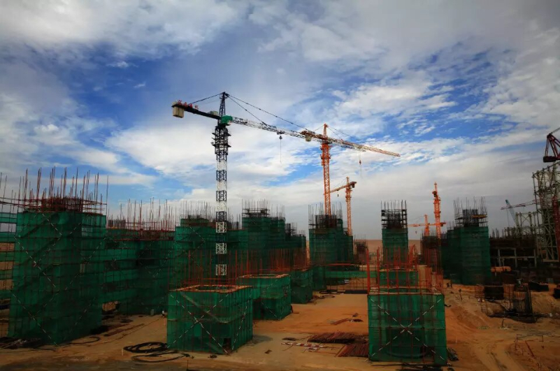 图为花园电厂施工机组冷却塔,花园电厂是新疆首家采用整套大型高效、节水、空冷燃煤机组的火电厂,2014年3月18日摄。