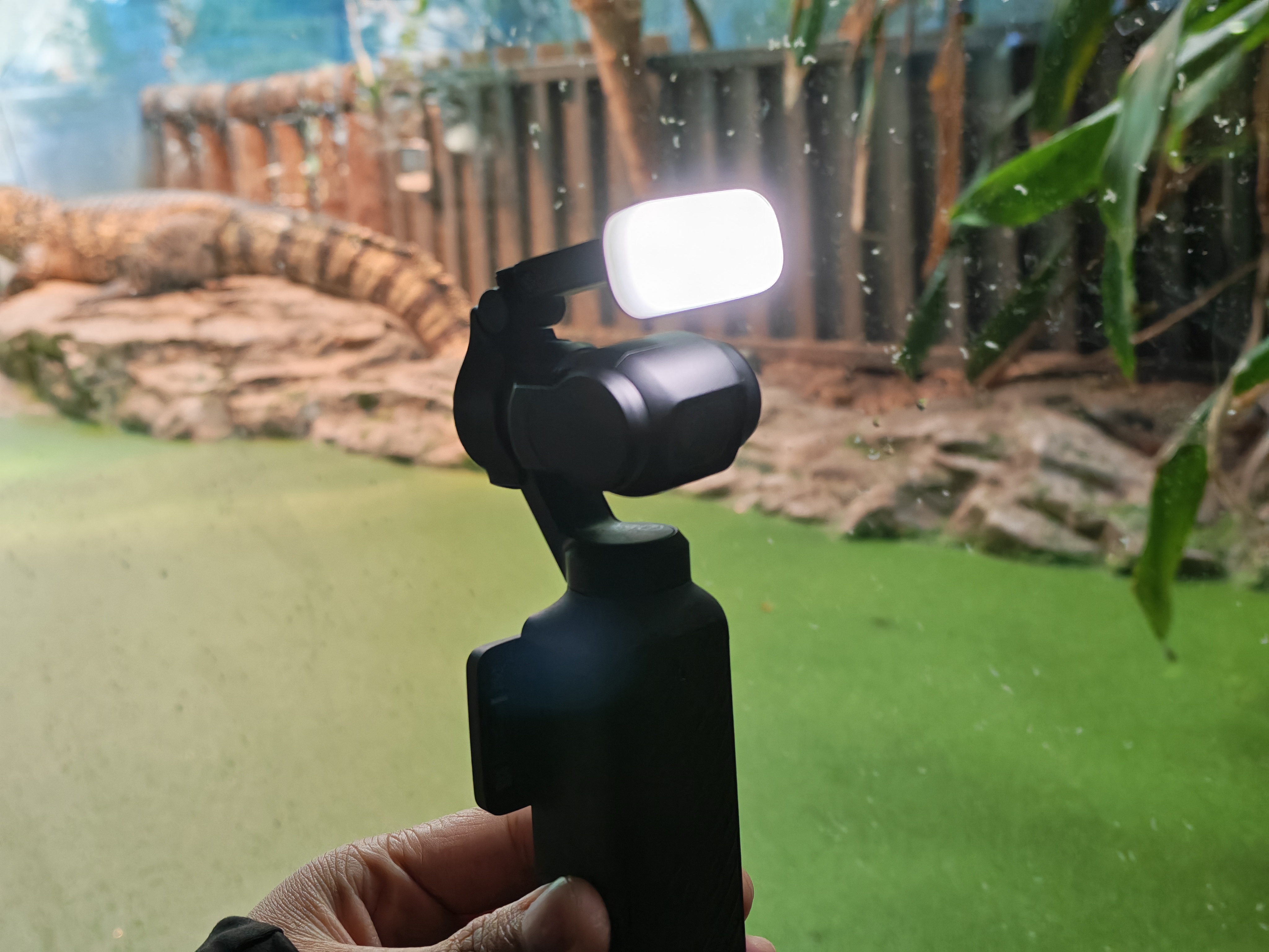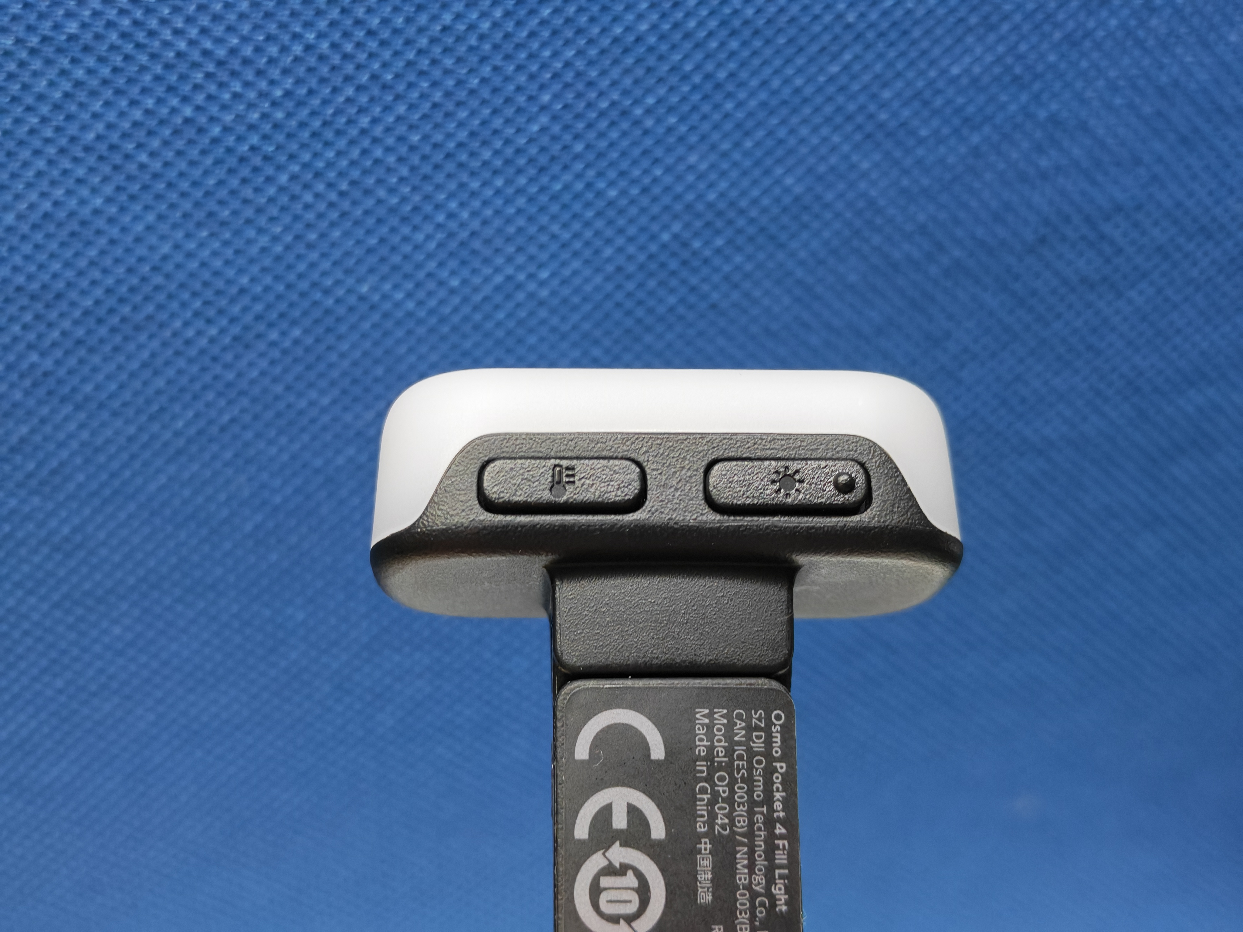 Pocket 4新增了一个有趣且实用的外设——补光灯。它与Pocket 4的连接设计十分巧妙,通过磁吸+卡扣的方式与机头触点相连,将Pocket 4开机,灯光会自动亮起。