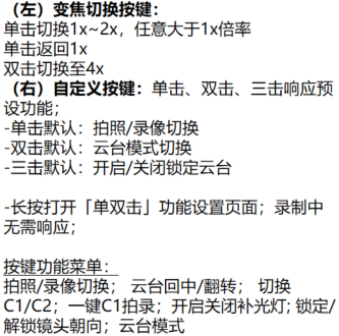 除了系统设定,用户还可以自定义C键功能,设置一组更适合自己的快捷键。通过单击,双击和三击的操作方式,将快速拍照,云台回中,云台翻转,拍照/录像,开启/关闭补光灯等常用的功能设置其中。