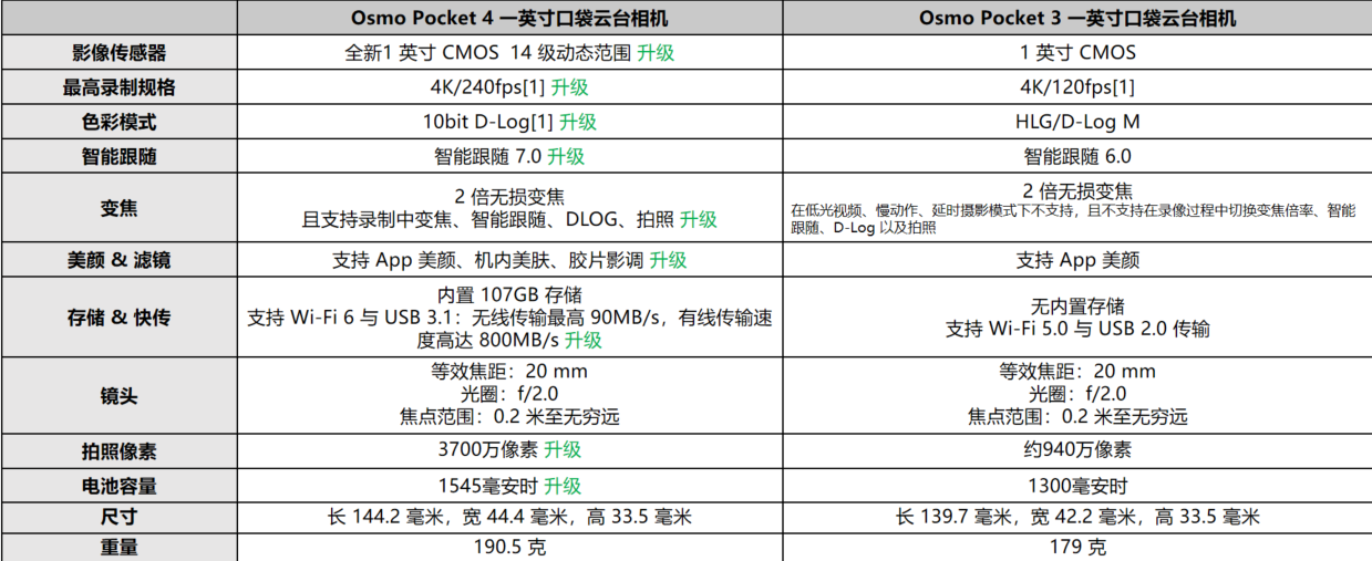 Pocket 4搭载全新1英寸传感器,在4K/60fps和4K/30fps分辨率选项下支持14挡动态范围。