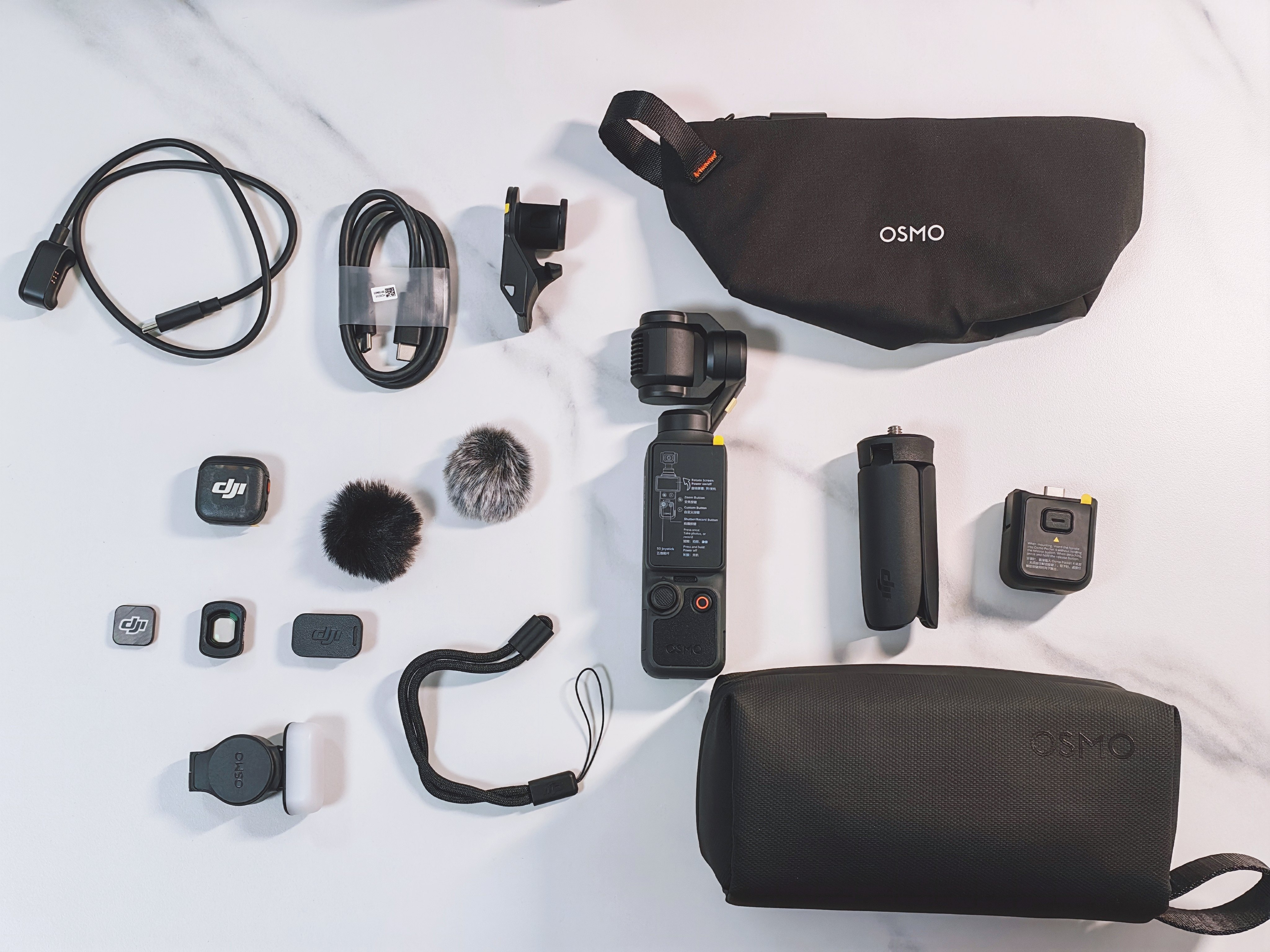 最后我们聊一聊这次的版本配件和外观。Pocket 4依旧提供全能套装版本。套装内包括Pocket 4一台,云台夹,1/4螺纹手柄,一大一小两个收纳包,补光灯,增广镜,Mic3发射器,磁吸背夹,Mic3发射器磁吸充电线,磁铁,两个防风毛罩,迷你三脚架,手绳和一条USB-C 3.1快充线。