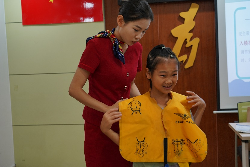 在莲麻村委会会议室,学院24级空中乘务专业的同学们为村里近20位中小学生带来了一场生动的“航空知识小课堂”。孩子们化身“小小乘务员”,学习航空安全知识和空乘礼仪。一位参与活动的学生兴奋地说:“我学会了系安全带和救生衣的使用,长大后也想当空乘员!”