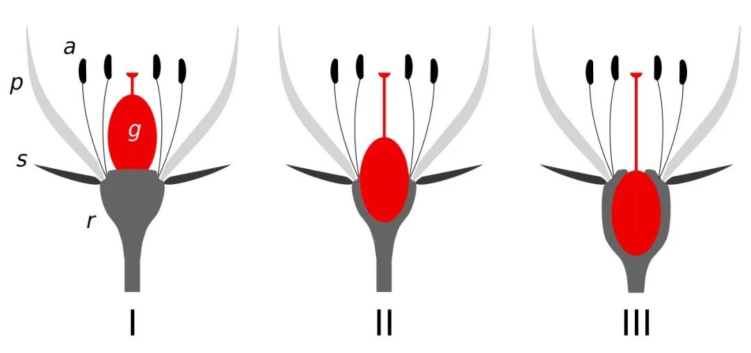 I:上位子房,II:半下位(中位)子房,III:下位子房。a:雄花器,g:雌花器,p:花瓣,s:萼片,r:花托 图源:维基百科