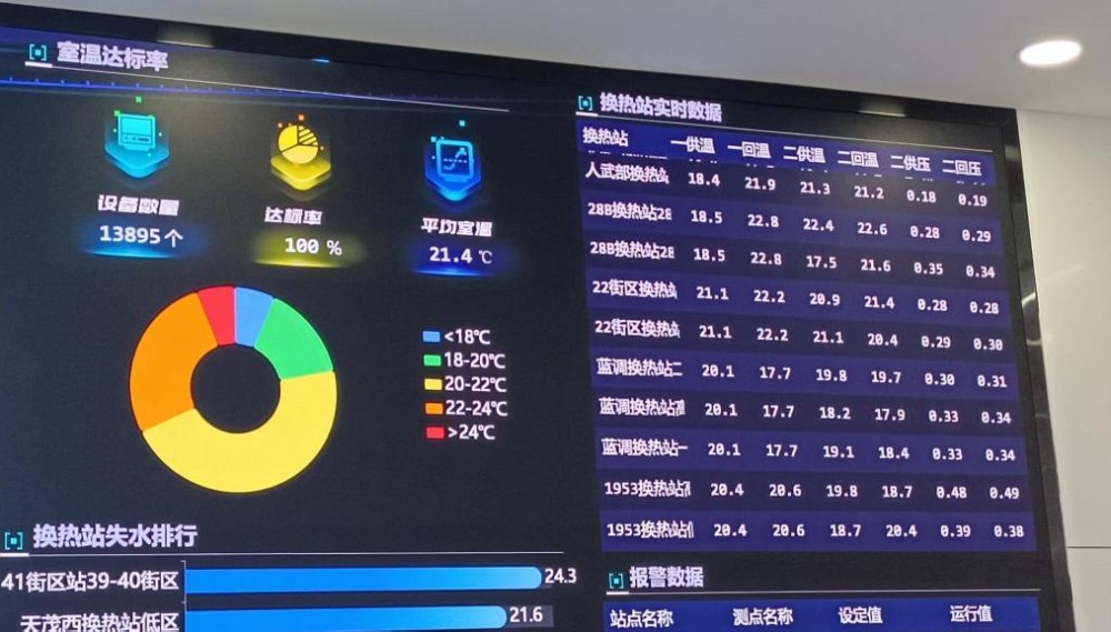 大屏幕上数字滚动变化,实时显示供热服务区域、平均室温及换热站数据情况。热力事业部党委委员、副总经理刘庆韬说:“依托这个智慧平台,我们可以对用户室温实时监测。一旦发现哪里温度异常,系统就会自动报警,维修人员可第一时间上门服务。”