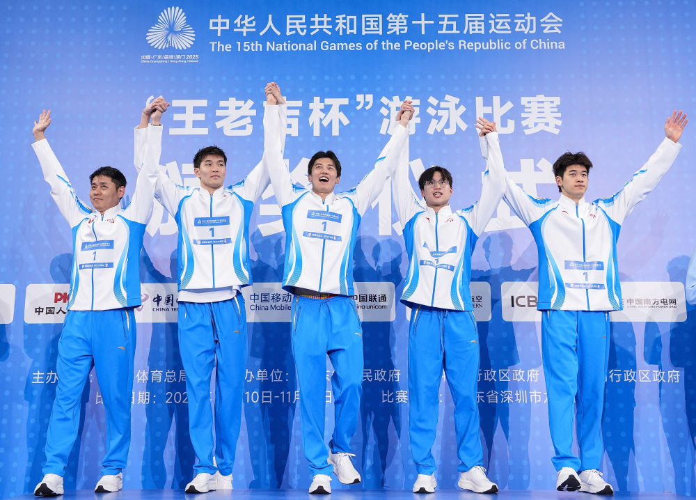 11月10日,冠军浙江队选手和教练在颁奖仪式上。当日,第十五届全国运动会游泳项目男子4X100米自由泳接力决赛在深圳举行。新华社记者 杜宇 摄