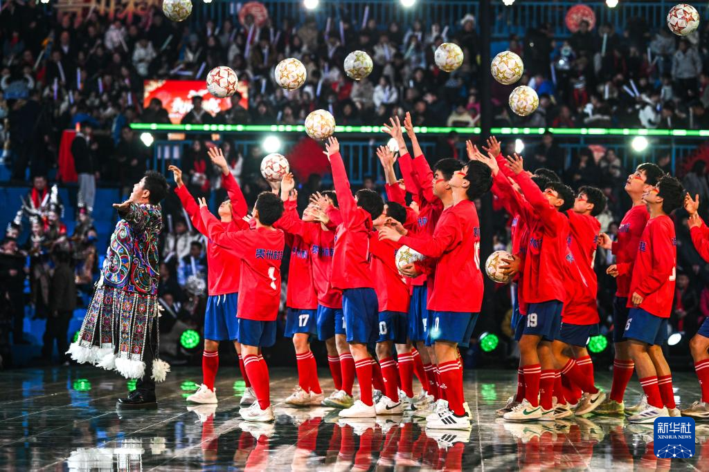 2月3日,孩子们在2026贵州“村晚”现场表演“村超”节目。新华社记者 杨文斌 摄