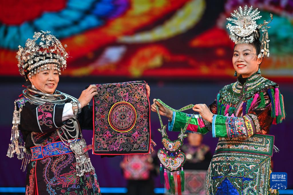 2月3日,村民在2026贵州“村晚”现场展示民族刺绣。新华社记者 杨文斌 摄