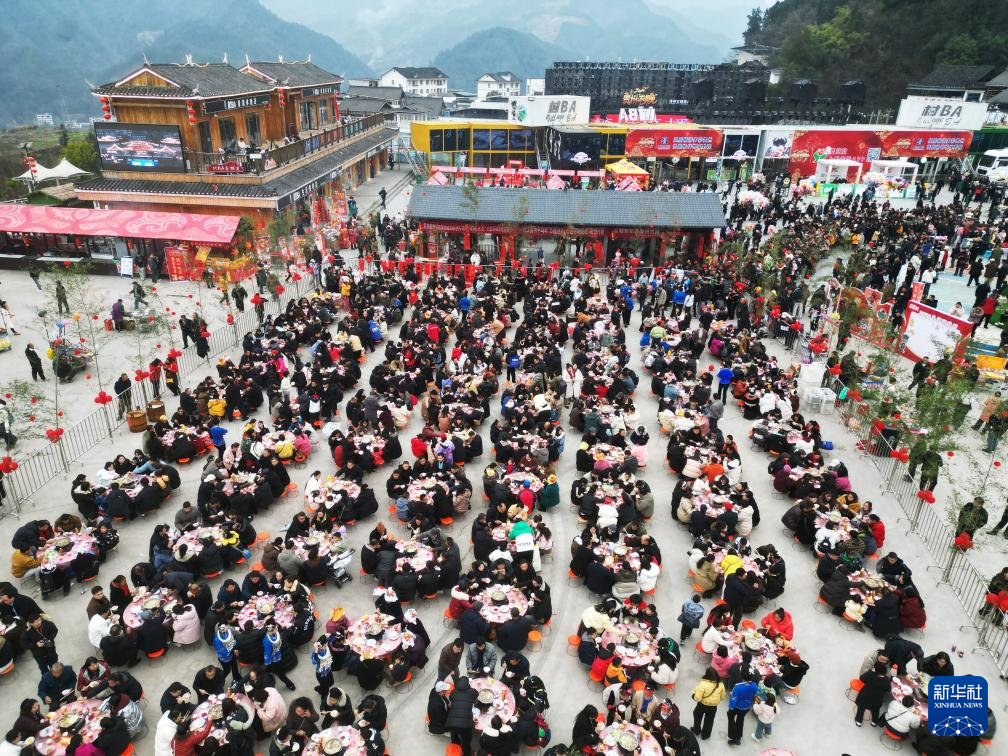 2月3日拍摄的台江县台盘乡台盘村“村晚”长桌宴现场。新华社发(余天英摄)