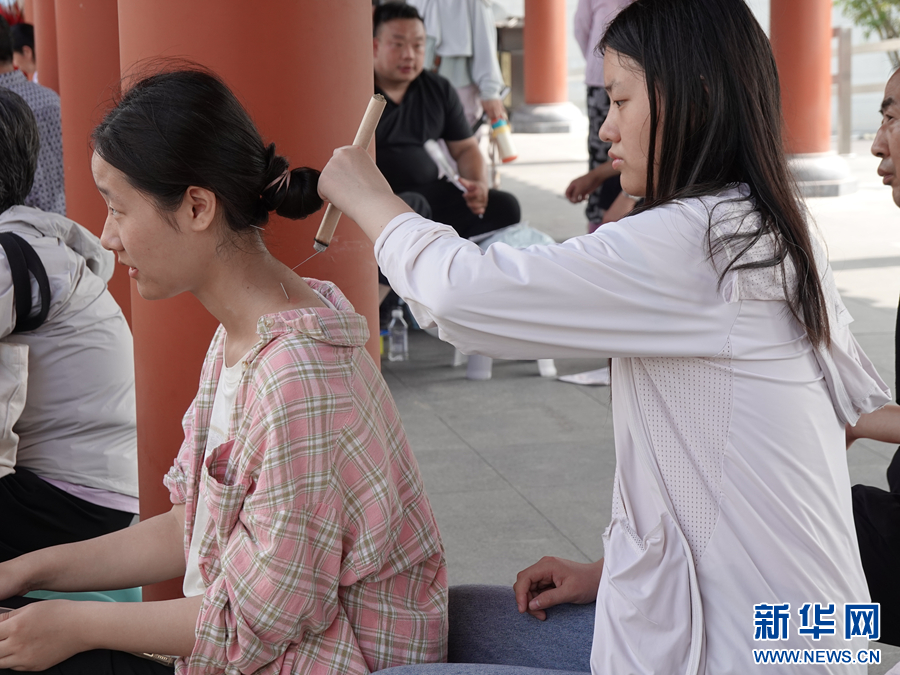 6月13日,在南阳医圣文化园,市民正在体验艾熏和针灸。
