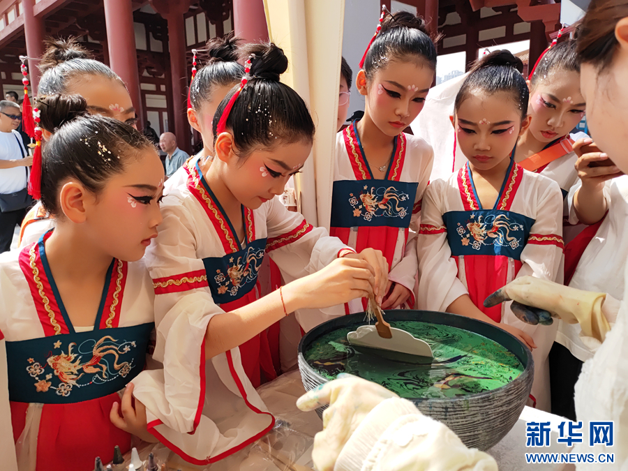 6月13日,在南阳医圣文化园,孩子们正在体验手工漆扇。