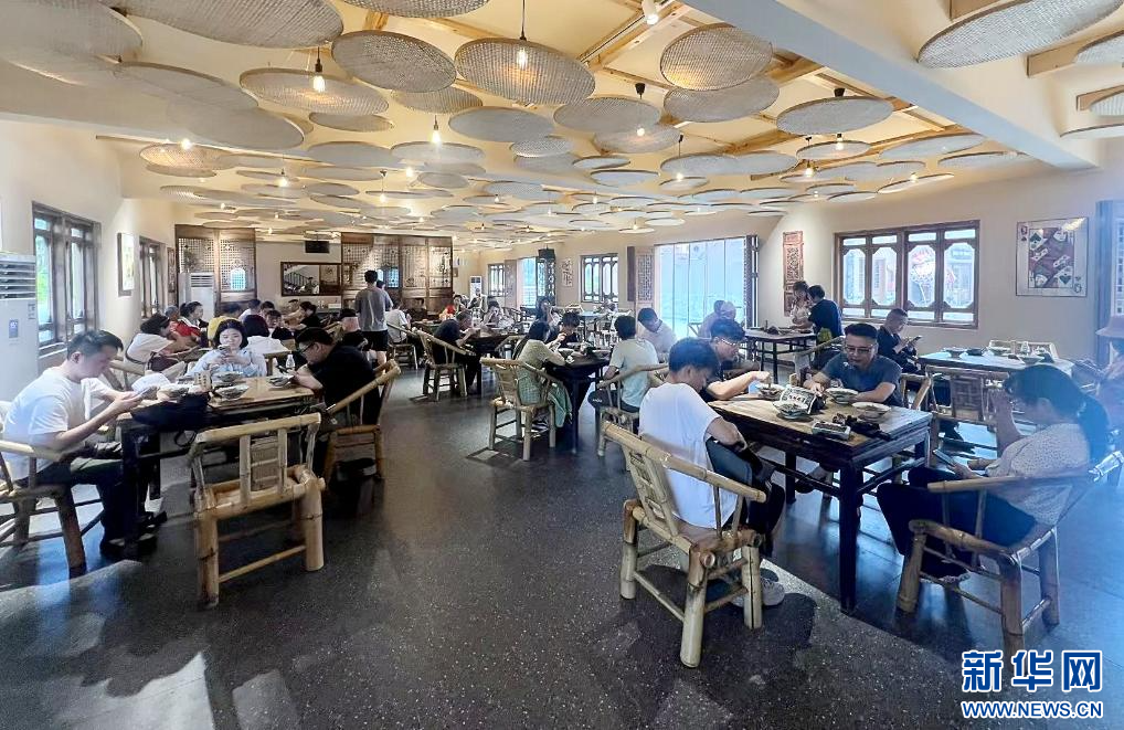 在江西定南客家古城景区,游客围坐品尝大碗茶。新华网 王晓震 摄