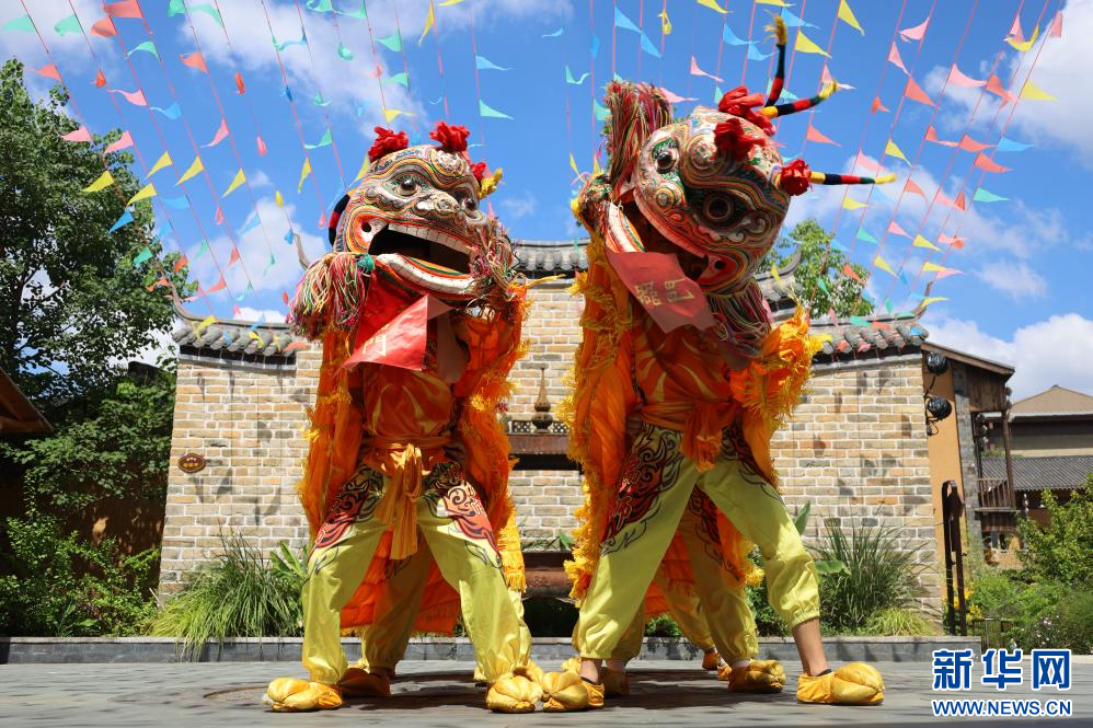 在江西定南客家古城景区,定南瑞狮队伍正在表演。新华网 王晓震 摄