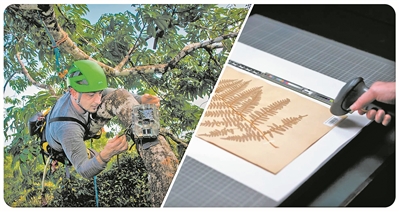 左图 一名攀岩者在法属圭亚那的一棵树上安装了一台野生动物摄像机。右图 英国邱园皇家植物园将一株独特的植物标本数字化,旨在向全球研究人员提供植物和真菌数据。图片来源:英国《自然》网站 田晶娟制图