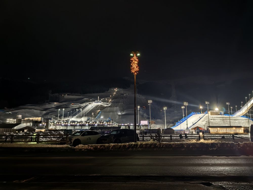 而当夜幕降临,冬奥会的U型场地和大跳台被灯光照亮,来自世界各地的运动员与繁星为伴,做着最后的赛前训练,这里的运动激情彻底被冬奥点燃。