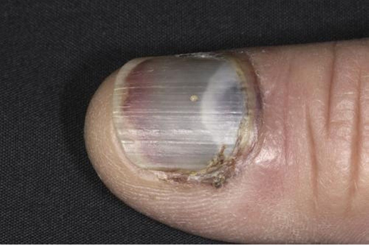甲下出血由挤压伤等急性创伤引起,导致血液积聚在指甲盖和甲床之间,外观上呈现蓝黑色或深紫色,久了之后会变成黑色或者红黑色,并可能伴随有指甲盖的分离或暂时性脱落。