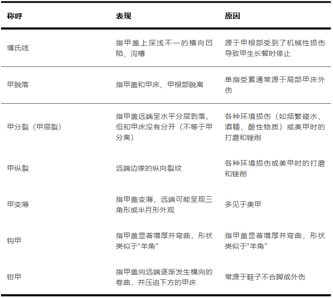 在日常活动、劳动过程中,指甲承担了众多受损伤的风险。有的是急性损伤,有的是慢性损伤。急性损伤通常来自突发性创伤,比如挤压、磕碰、重物撞击、意外事故。慢性损伤多由重复性的微创伤、环境暴露或不良习惯(如咬甲、剔甲或不当的美甲操作)引起的。它们的表现之一,都可以是上面图中的这种指甲开裂。