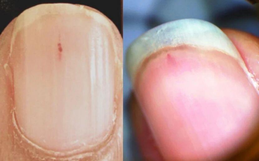 如果是一点点出血,我们叫作裂片状出血,如果是一团团地出血,则叫作甲下出血或者甲下血肿。
