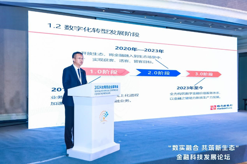 8月23日,2024太阳岛企业家年会金融科技发展论坛在黑龙江省哈尔滨市举行。本次论坛以“数实融合 共筑新生态”为主题,来自海内外优秀企业家、经济学家、企业负责人、新锐创业者等200余位嘉宾齐聚太阳岛。在论坛主旨演讲环节,哈尔滨银行党委副书记、行长姚春和作了题为《以数字化转型引领金融服务模式变革 推动做实做透“五篇大文章”》的主旨演讲。