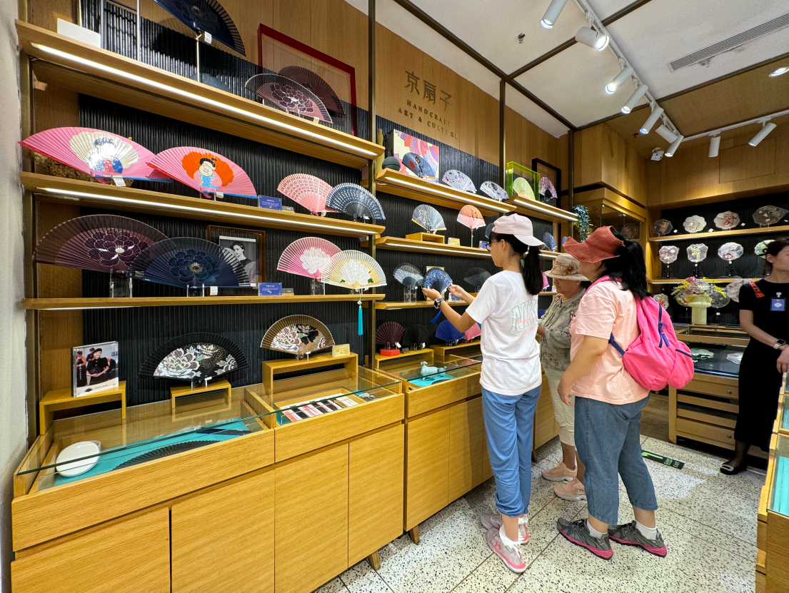 “每一面扇子都很精致,有点挑花眼了。”不少游客看到京扇子的产品总会有这种感觉,那些将传统制扇工艺与现代审美结合,各式各样的时尚折扇、缂丝宫扇、双面绣团扇等让游客目不暇接。其中,华谊牡丹系列折扇最为精致显眼。“扇骨是用6到8年的头青竹进行高温染色,扇面采用真丝双面漆绘工艺。”京扇子店员李爱英介绍,华谊牡丹系列折扇一直深受境外游客青睐,他们可以通过这一把小小的扇子了解中国传统文化。
