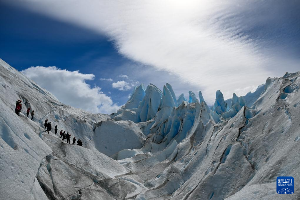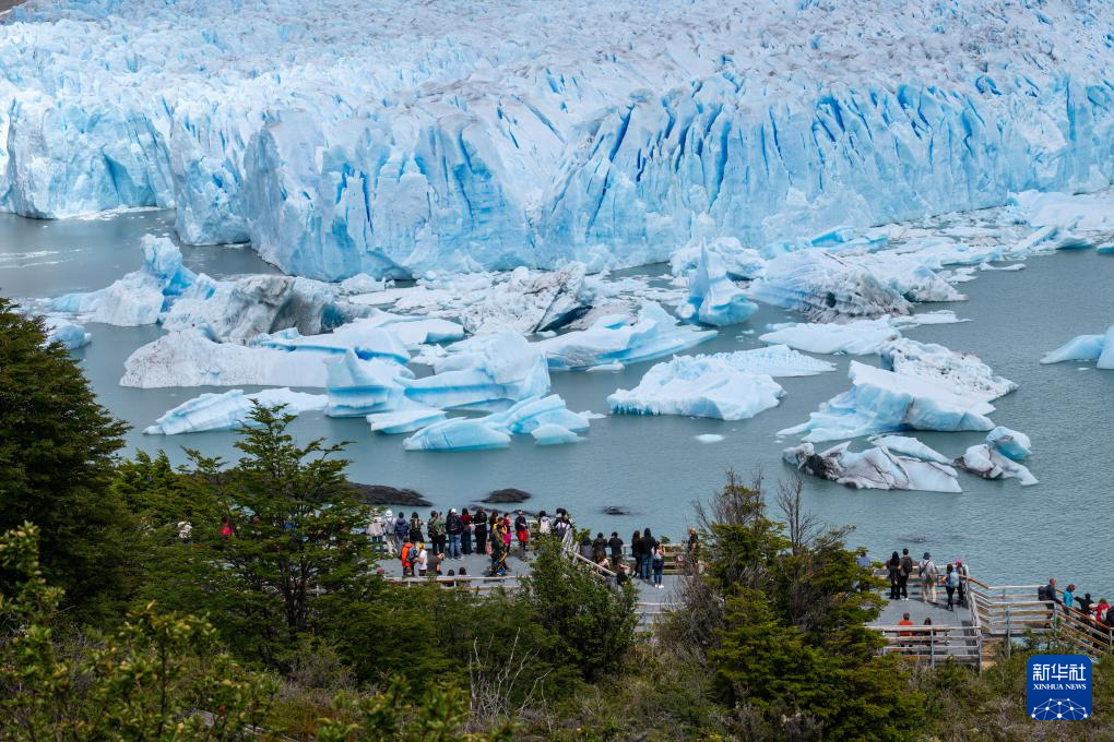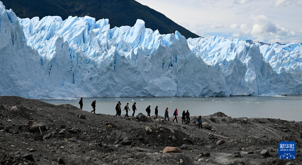 1月3日,游客在阿根廷圣克鲁斯省冰川国家公园内的莫雷诺冰川上行走。
