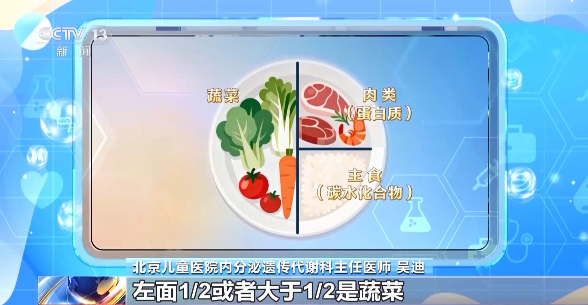 北京儿童医院内分泌遗传代谢科主任医师吴迪:早上要吃饱,开启一天的生活元气满满,中午要吃好,营养要均衡搭配,晚上要吃得早一些,吃得少一些,睡觉前2到3个小时不建议进食。一般情况下一个圆盘子,可以中间画一条线,左面1/2或者大于1/2是蔬菜,右侧上面1/4是蛋白质,右侧下面1/4是主食。