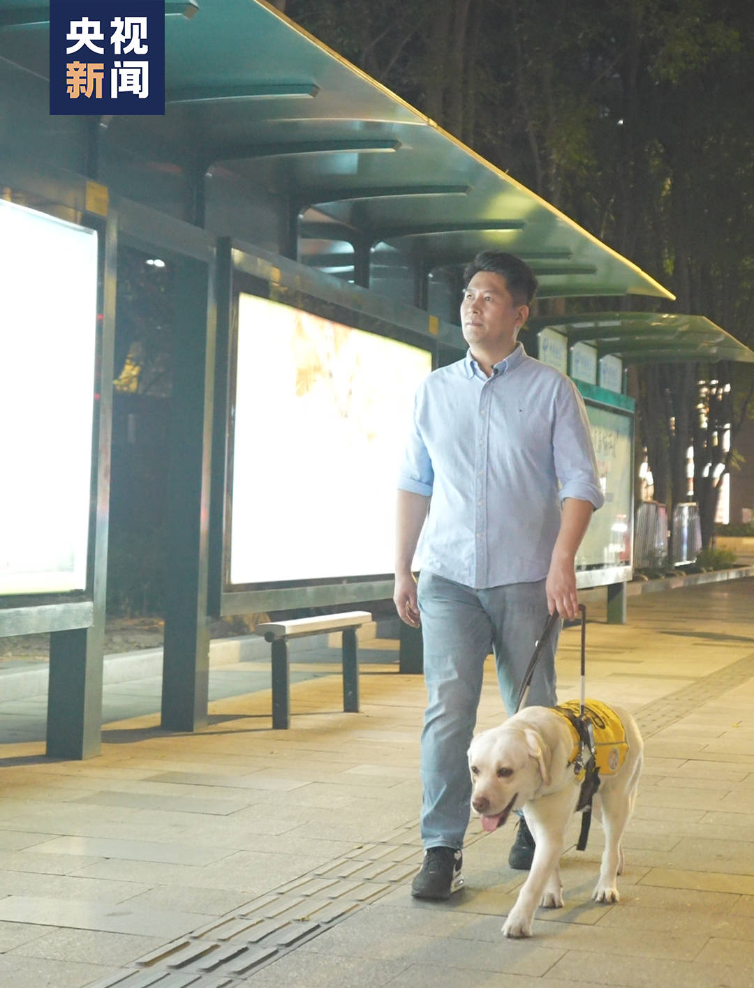 赵秋宝继续往前走,但经过环岛时由于方向判断失误,他在错误方向越走越远。一位骑车路过的阿姨看到导盲犬后,从身后叫住他关心道:“能看清楚吗?”