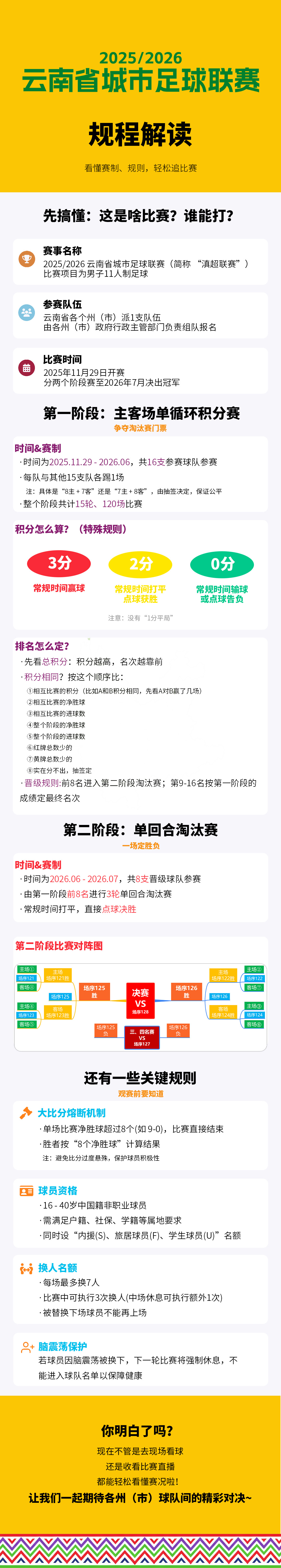 2025/2026云南省城市足球联赛(简称“滇超联赛”)将于2025年11月29日至2026年7月在云南省各州市举行,此次比赛集结了云南省16个州(市)的16支队伍,共有120场比赛,时间跨度长达8个月,揭幕战将于11月29日在玉溪高原体育运动中心开赛。从高原雪山到热带雨林,从峡谷之畔到广袤田园,16座主场、16支队伍掀起云南足球运动的热潮!这到底是啥比赛?谁能参加?赛制、规则又是啥样的?跟随新华网一图看懂赛程,轻松追比赛!(罗春明 丁凝)