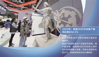 如今,3D打印技术正加速从实验室走进生产线和生活场景。国家统计局近日发布的数据显示,2025年,我国3D打印设备产量同比增长52.5%。这背后有什么因素推动?行业发展还面临哪些机遇和挑战?