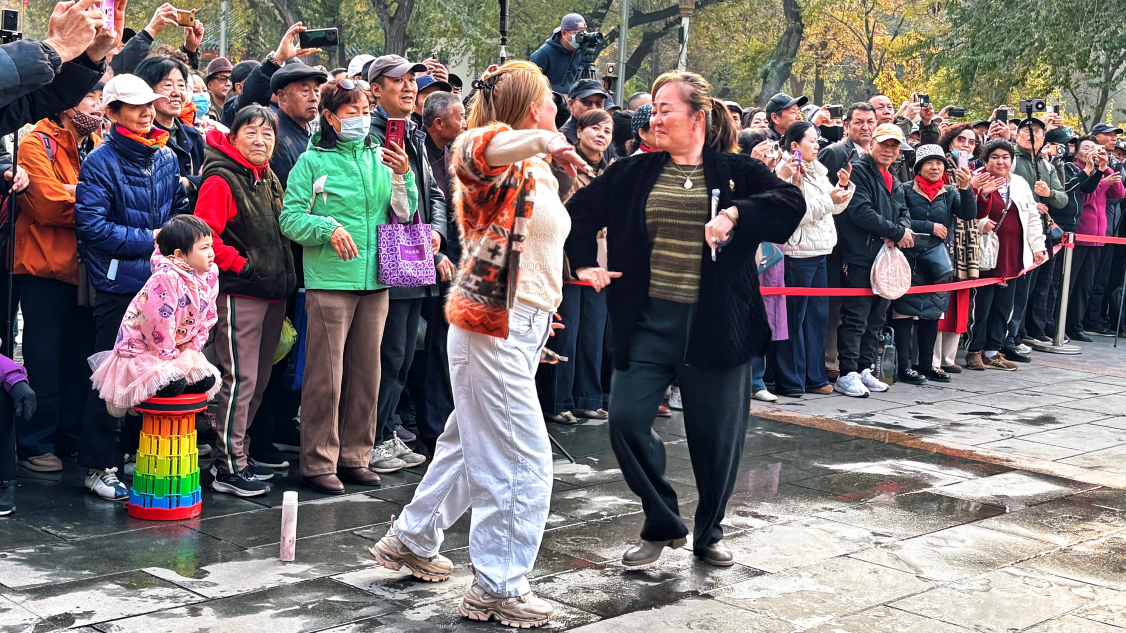 10月23日,“打起手鼓唱起歌”首届中国新疆民间艺术季优秀节目巡演人民公园朝阳阁演出现场,现场观众跳起《黑走马》。迪丽娜尔 摄