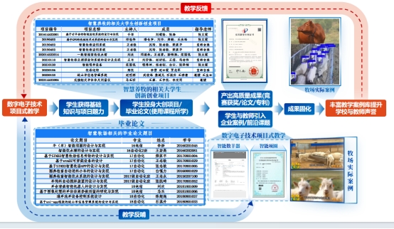 毕业论文、大学生创新创业项目、内蒙古特色的企业案例,共同作用于《数字电子技术》课程的项目式教学,构成了一个多层次、立体化的反哺循环。从学生毕业论文和大学生创新创业项目中提炼智慧牧场的题目,结合鄂尔多斯市阿尔巴斯山羊智慧牧场结合形成了课程教学的项目案例:牛(羊)智能项圈的设计和智能数羊器的设计,打造“真实企业案例-完整任务链条-阶梯能力培养”三位一体的工程实践创新项目体系,通过项目,培养学生从技术实现到系统集成的全流程能力。