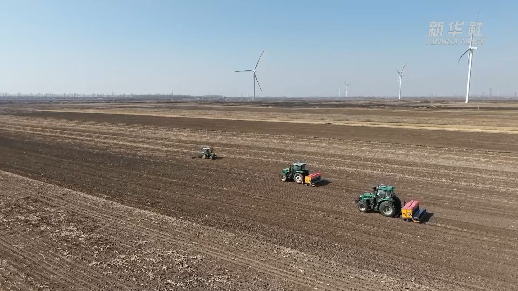 春耕时节,在辽宁省铁岭市铁岭县蔡牛镇,播种机正在播种春小麦。