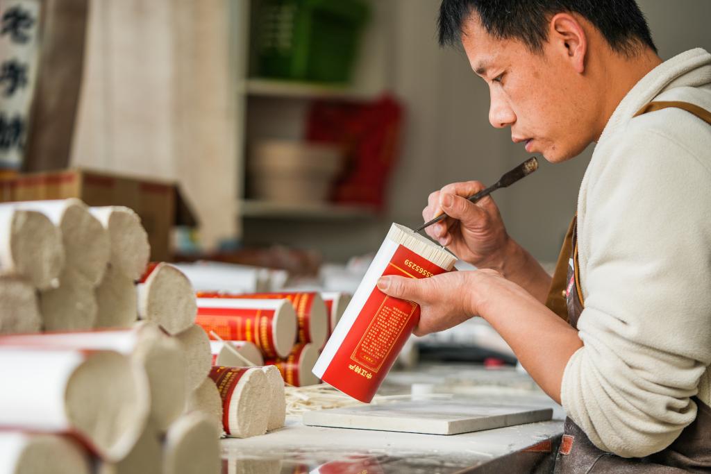 2月22日,在四川省德阳市中江县觉慧村,村民在包装手工面条。