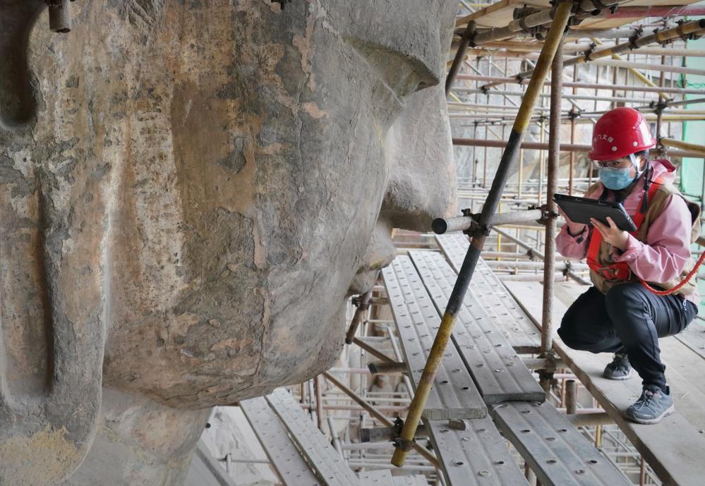 2022年4月14日,工作人员在洛阳龙门石窟奉先寺进行勘测作业。新华社记者 李安 摄