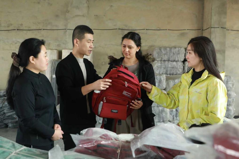 在高碑店市新城镇王瓜园村的一家箱包加工企业,采购商正查看背包成品。(马凯 摄)