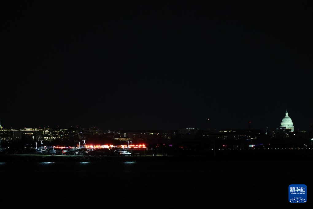 1月29日,在美国华盛顿里根国家机场附近,应急车辆在客机坠河事故现场待命。新华社记者 胡友松 摄