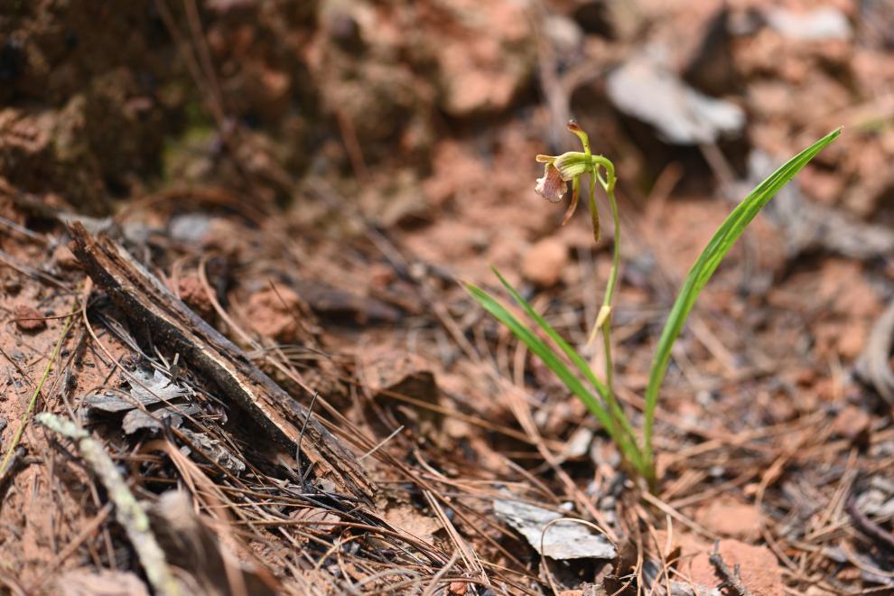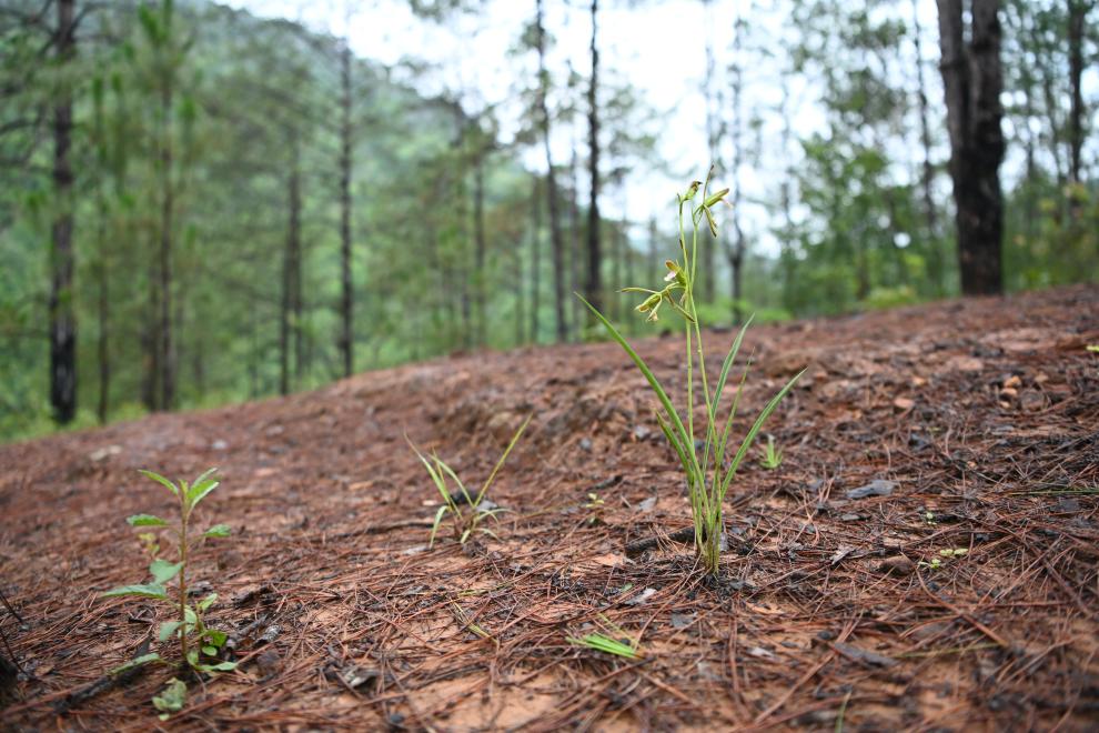 此次在元江河谷发现的单花美冠兰居群,其种群数量约50株,生长于海拔1120米的云南松林下贫瘠黄红壤或石砾缝隙中,长势较为良好,但开花植株较少。通过对比模式标本和原始文献,科研人员发现,单花美冠兰虽名为“单花”,但健壮个体可开2至3朵花,叶片长度与宽度也有一定变异幅度。