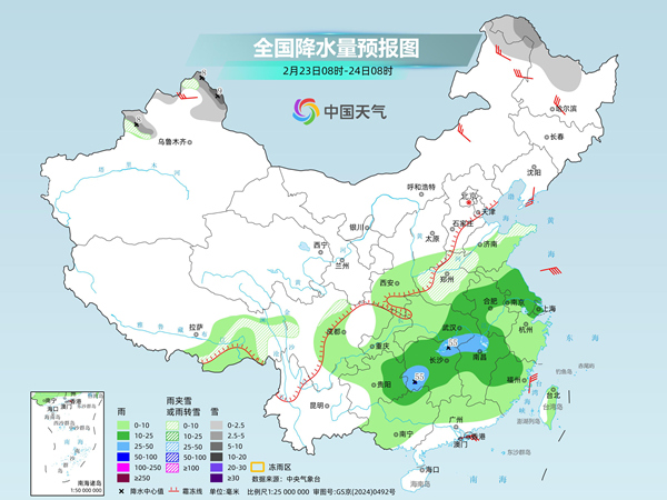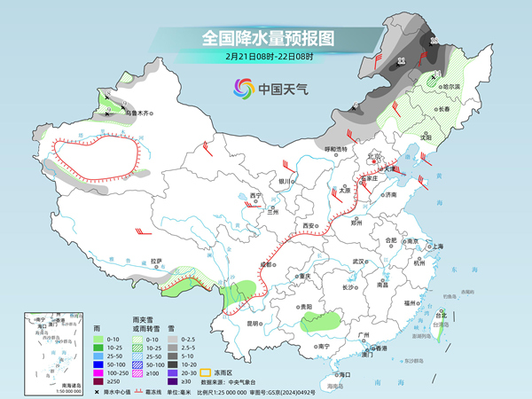 后天,内蒙古东北部、黑龙江西北部、新疆北疆北部和伊犁河谷、西藏东南部、山东半岛、黄淮西部、川西高原北部等地部分地区有小雪或雨夹雪,其中,黑龙江西北部、新疆阿勒泰和伊犁河谷等地部分地区有中到大雪。江淮大部、江汉东部、江南中北部和西部、贵州中东部等地部分地区有中到大雨,其中,湖南东北部和西部等地部分地区有暴雨。