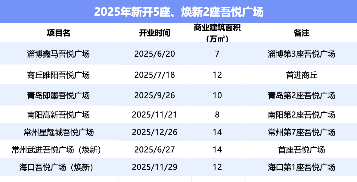 吾悦商管起步于常州,历经三十余年深耕与转型,已基本完成全国重点城市群、重点城市的布局,产品协同与战略纵深的优势逐步显现。2025年,吾悦商管新开业5个商业项目,同时完成2个项目焕新升级,涉及常州武进吾悦广场、海口吾悦广场,持续巩固并深耕优势市。