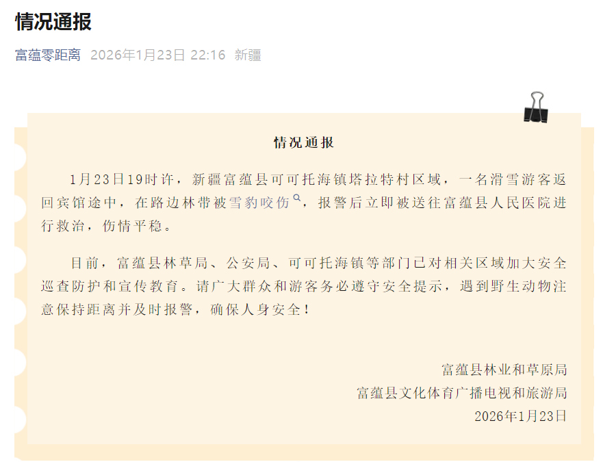 1月23日,新疆富蕴县发布情况通报,当日19时许,该县可可托海镇塔拉特村,一名滑雪游客返回宾馆途中被雪豹咬伤,报警后立即送往医院救治,伤情平稳。
