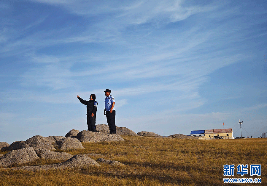 护边员张永清与妻子刚巴特尔在眺望边境线。新华网 徐红梅 摄