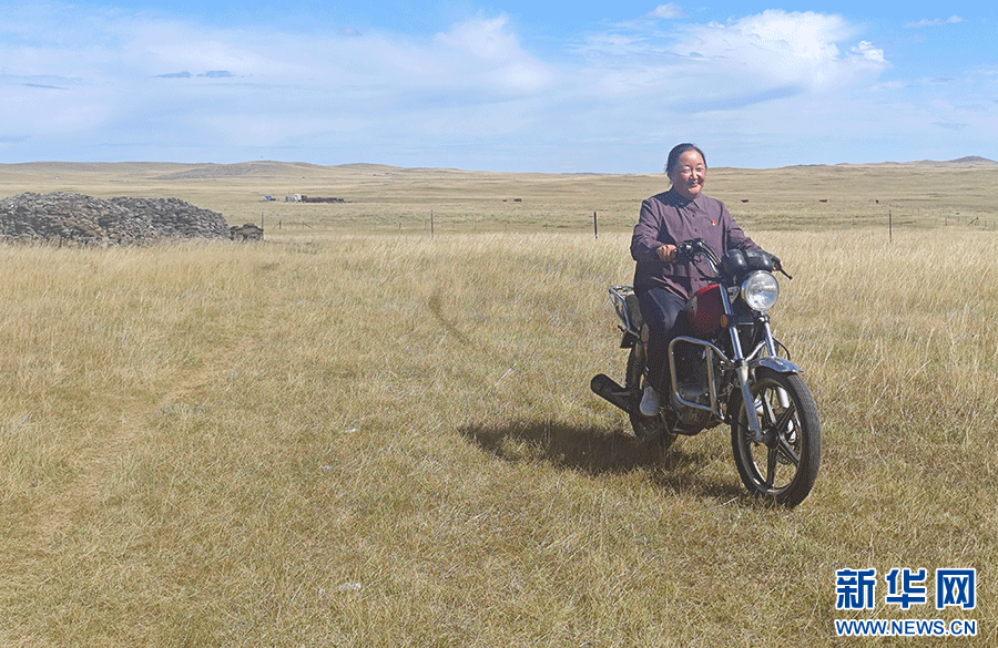 图雅骑摩托车行驶在草原上。新华网 徐红梅 摄