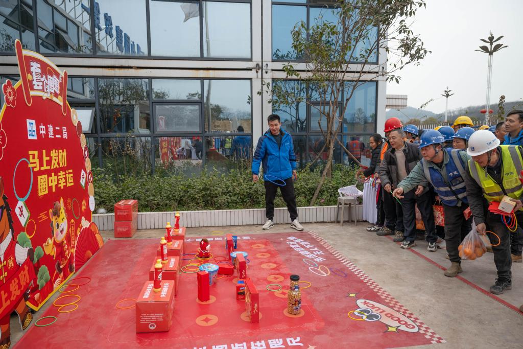 2月5日,中建二局联合重庆市江津区总工会在重庆枢纽港先进机电装备和物流产业园项目工地举行游园活动。活动以“情系建设者 欢喜迎新年”为主题,包含写春联、投壶、拔河比赛等活动内容,让工友们感受节日温暖。