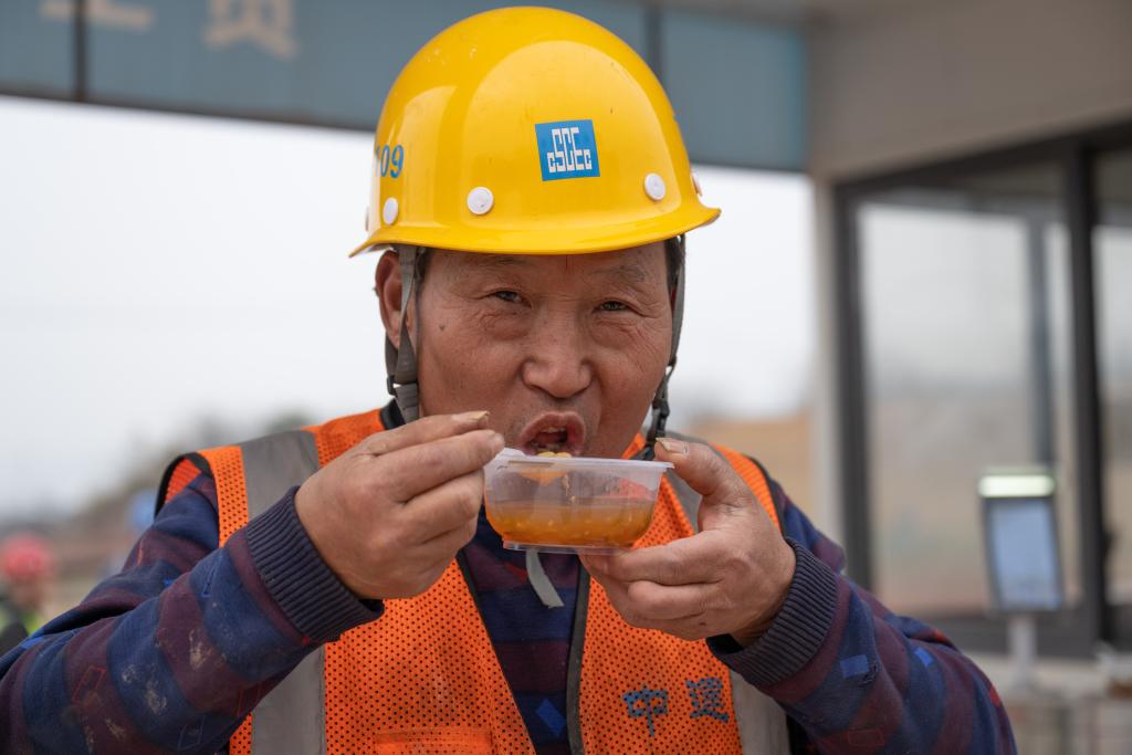 2月5日,在重庆市江津区重庆枢纽港先进机电装备和物流产业园项目建设现场,工人在吃汤圆。新华社记者 陈诚 摄