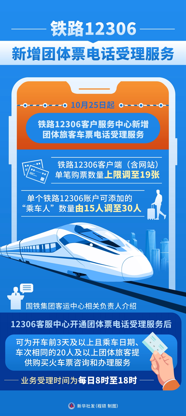 新华社北京10月25日电(记者樊曦)记者从中国国家铁路集团有限公司获悉,25日起,铁路12306客户服务中心新增团体旅客车票电话受理服务,铁路12306客户端(含网站)单笔购票数量上限调至19张,单个铁路12306账户可添加的“乘车人”数量由15人调至30人。