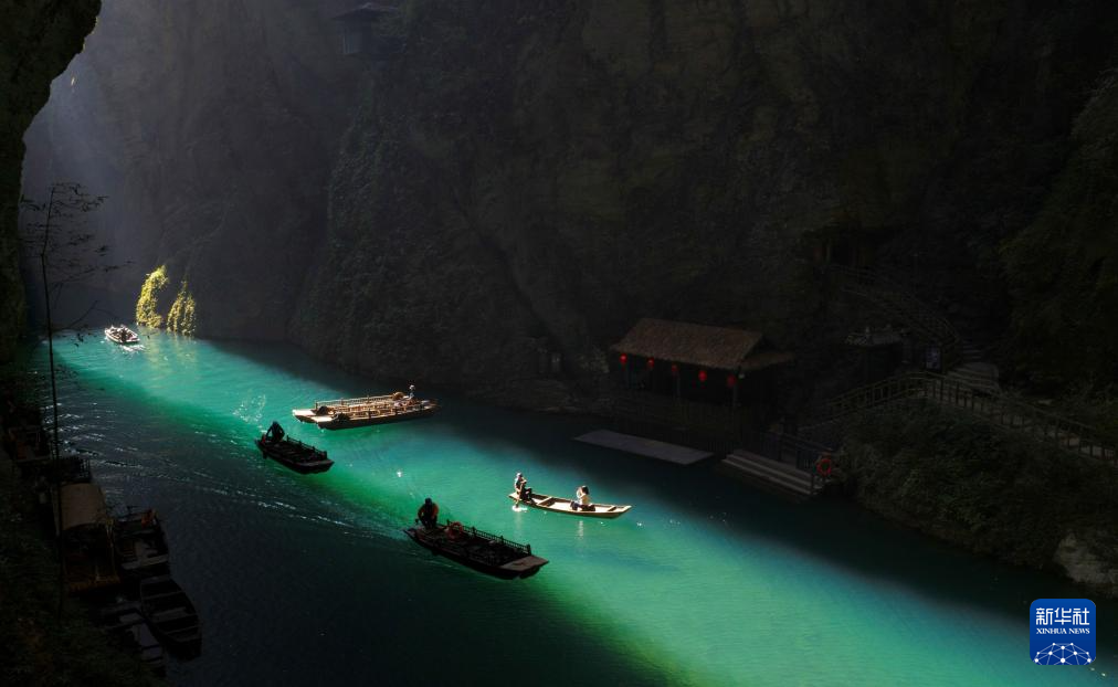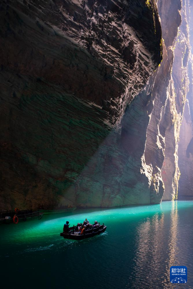初冬时节,湖北省恩施土家族苗族自治州鹤峰县屏山峡谷迎来迷人景观。正午时分,阳光穿过幽深峡谷,将蜿蜒的“一线天”照亮,舟行水上若悬浮于空中,形成了独特的“舟浮空中”奇观。